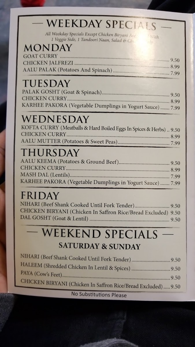 Welcome to Kabob N Karahi, a culinary gem nestled in Silver Spring, MD, where the vibrant flavors of Pakistan come to life. This restaurant serves a hearty selection of traditional dishes that cater to every palate. On Monday, savor the Chicken Jalfrezi with its tender chicken in a richly spiced sauce, or on Tuesday, indulge in the Palak Gosht, a delightful blend of tender meat and spinach.